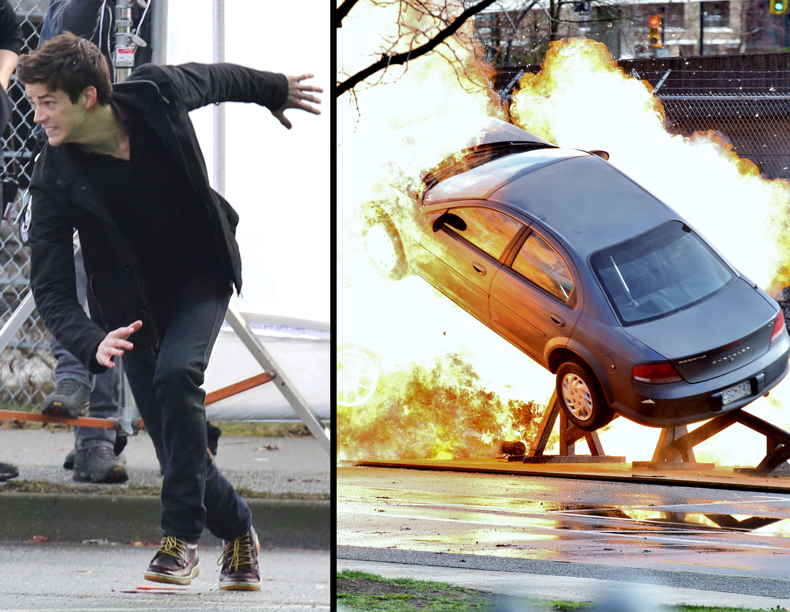 51351248 “Glee” actor Grant Gustin films an action scene (out of the costume) on the set of “The Flash” on March 9, 2014 in Vancouver, Canada. Grant looked to have cut his finger for real while running and diving from a huge car explosion! FameFlynet, Inc – Beverly Hills, CA, USA – +1 (818) 307-4813