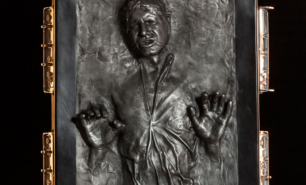 The Han Solo in Carbonite life-size figure replica will cost you $6,999, with flexible payment plans available. The replica stands seven-and-a-half foot tall and features light effects on the sides panels and base.