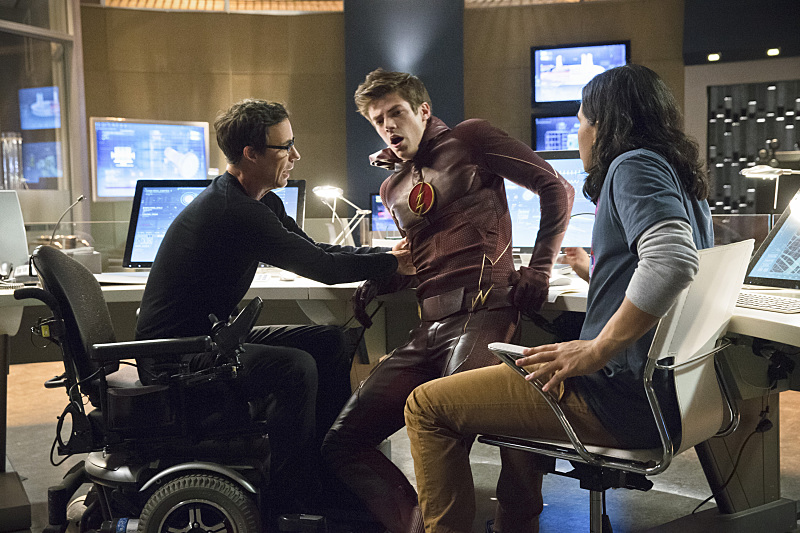 The Flash — “Things You Can’t Outrun” — Image FLA103b_0120b — Pictured (L-R): Tom Cavanagh as Dr. Harrison Wells, Grant Gustin as Barry Allen, and Carlos Valdes as Cisco Ramon — Photo: Jack Rowand/The CW — é 2014 The CW Network, LLC. All rights reserved.