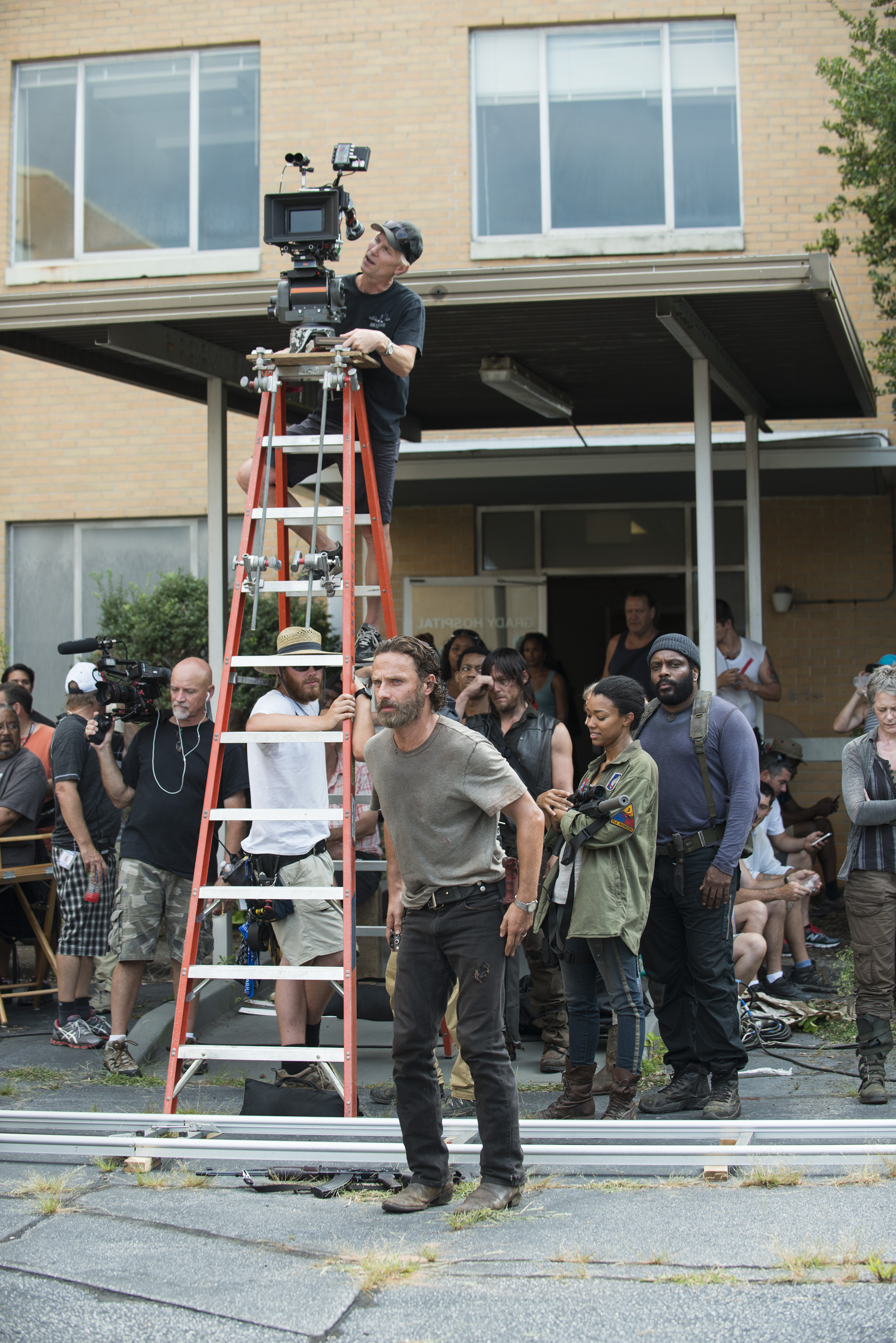 Andrew Lincoln, Norman Reedus, Tyler James Williams, Sonequa Martin-Green, Chad Coleman and Melissa McBride – The Walking Dead _ Season 5, Episode 8 _ BTS – Photo Credit: Gene Page/AMC