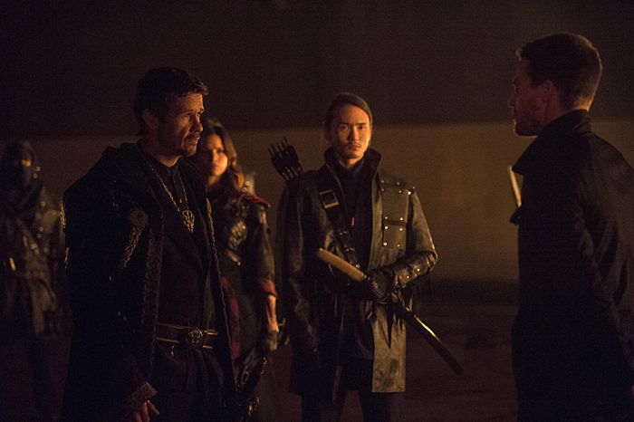 Arrow — “The Climb” -Pictured (L-R): Matt Nable as Ra’s al Ghul, Katrina Law as Nyssa al Ghul, Karl Yune as Maseo and Stephen Amell as Oliver Queen — Photo: Cate Cameron/The CW — é 2014 The CW Network, LLC. All Rights Reserved.