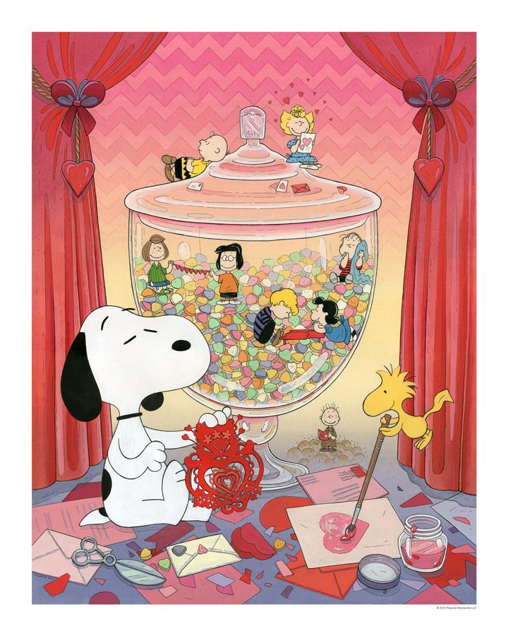 “Growing up it seems like there was always aspects of Peanuts that were part of our lives. Watching Peanuts TV specials over the holidays and hanging little ornaments of Snoopy and characters on our Christmas tree, or the time I got a really big valentine with Snoopy holding a heart. So when I was asked to create a piece based on Peanuts, I immediately thought of all these fun times I had with my family and friends.”