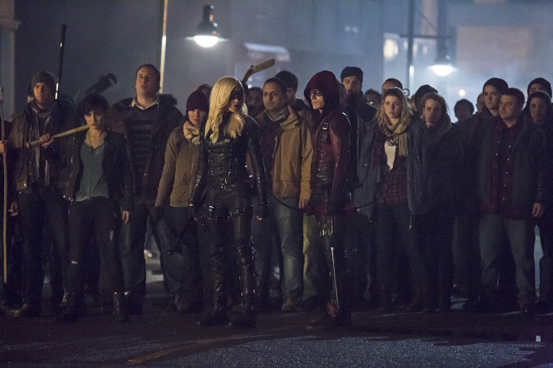 Arrow — “Uprising” — Image AR312B_0137b — Pictured (From Center L-R): Katie Cassidy as Black Canary and Colton Haynes as Arsenal — Photo: Katie Yu/The CW — é 2015 The CW Network, LLC. All Rights Reserved.