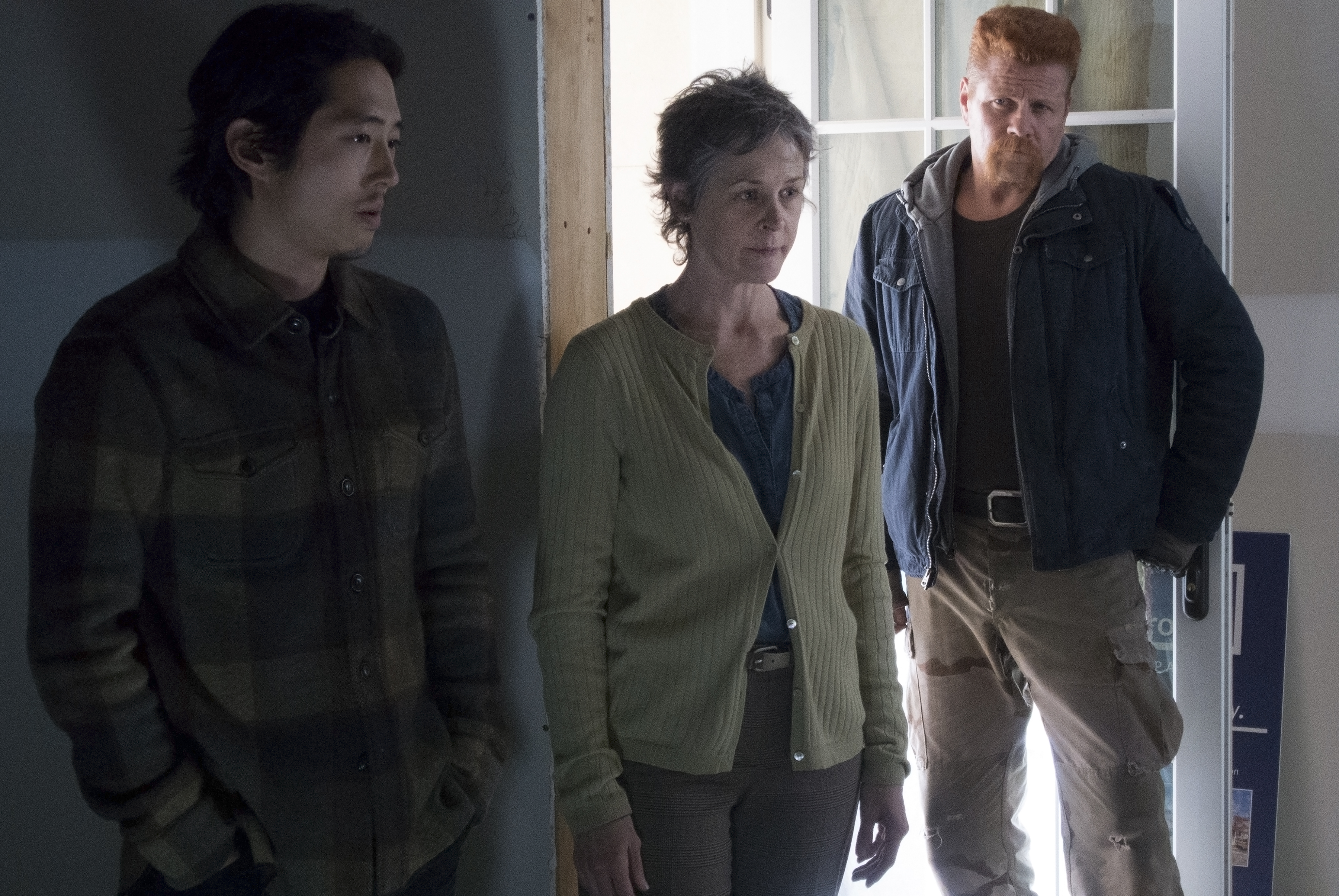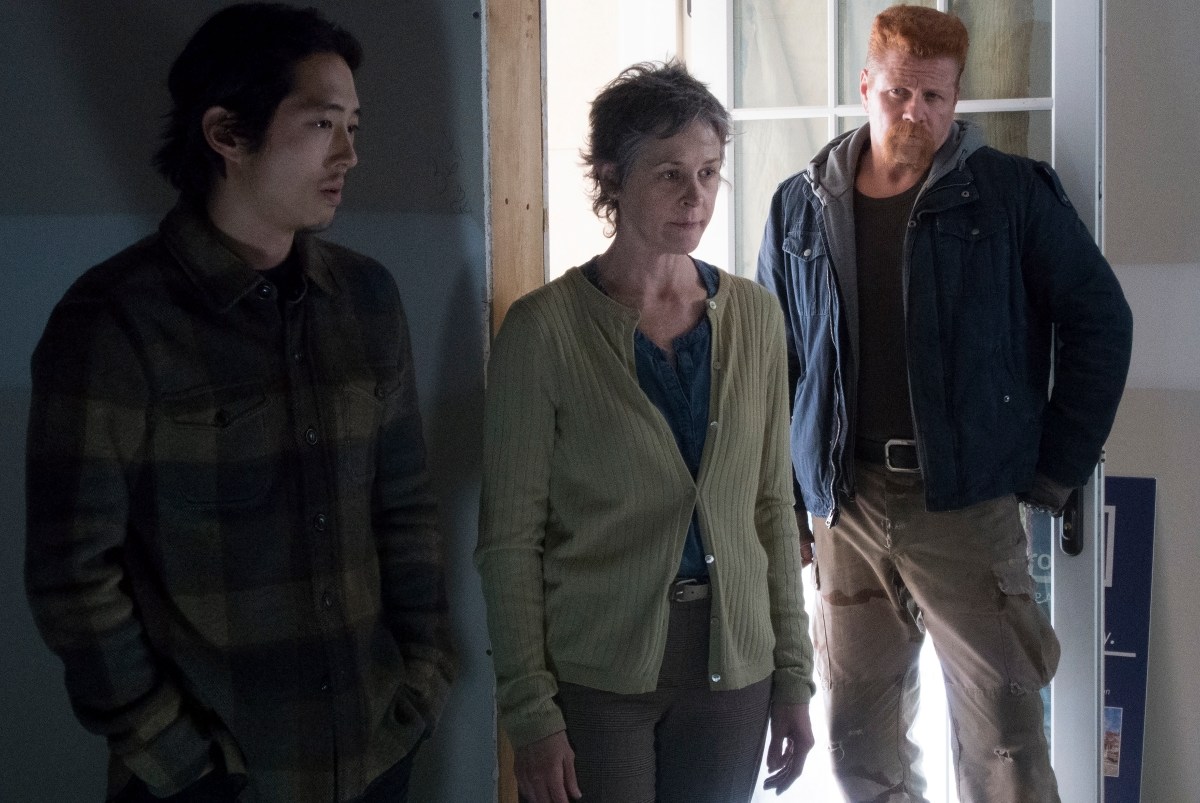 Steven Yeun as Glenn Rhee, Melissa McBride as Carol Peletier and Michael Cudlitz as Abraham – The Walking Dead _ Season 5, Episode 16 – Photo Credit: Gene Page/AMC