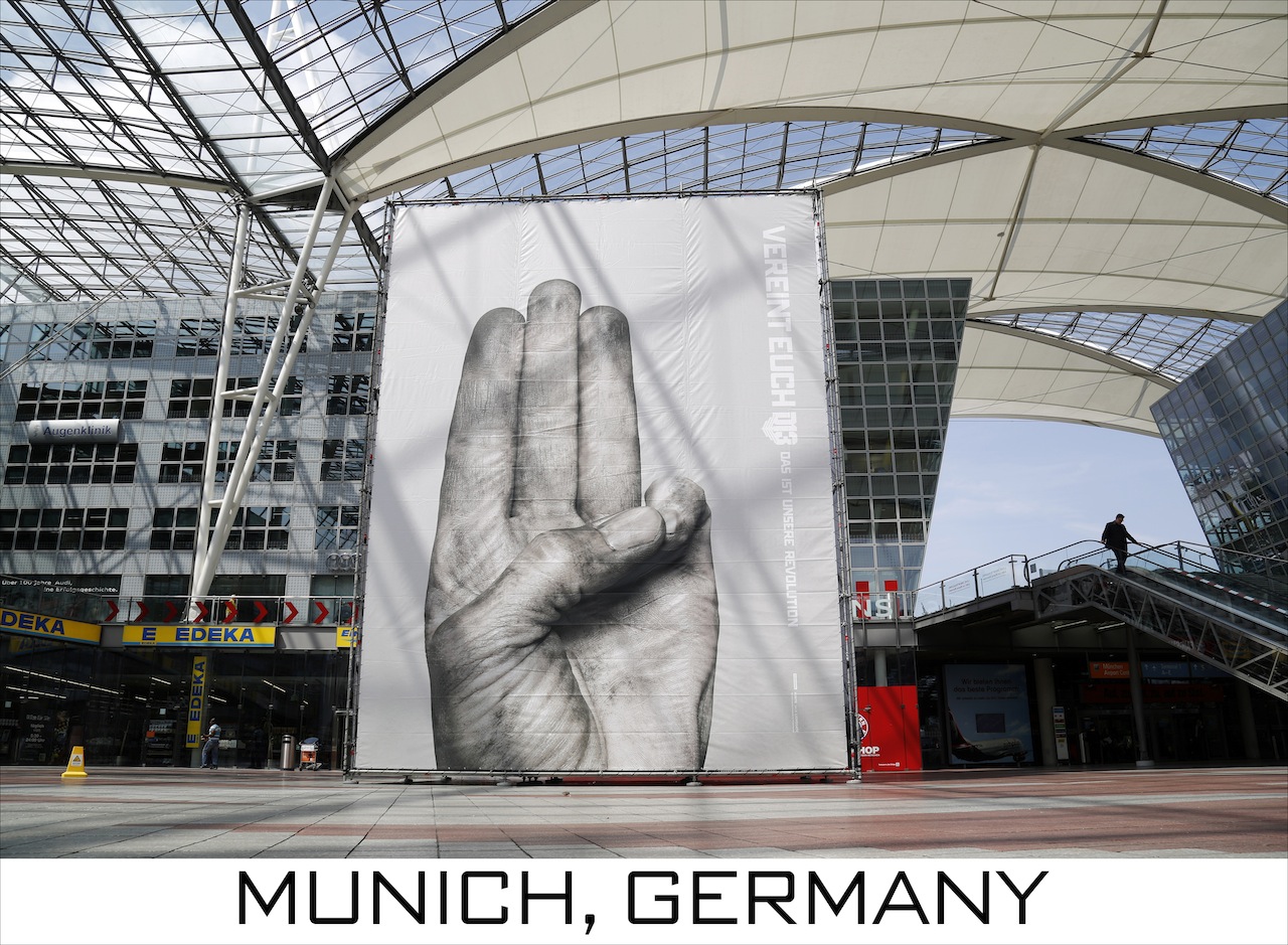 Vereint Euch – billboard MUC Previous Next Published June 20, 2015 at 1280 × 939 in ‘3-Finger Salute’ Marketing For ‘Hunger Games: Mockingjay – Part 2′ Launches Globally Vereint Euch billboard at Munich Airport Munich, Germany June 17, 2015 ©STUDIOCANAL/Kurt Krieger