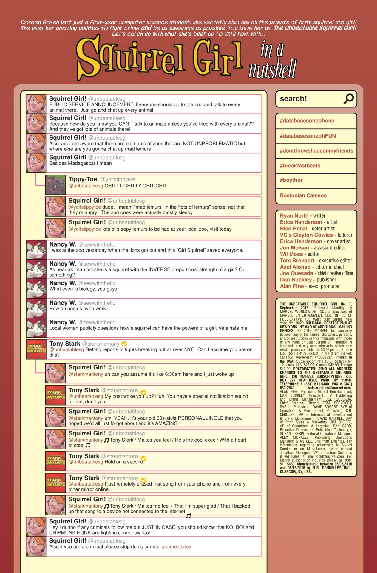 • Our friend Squirrel Girl doesn’t like our new friend Girl Squirrel! In this issue we’ll discover if this dislike is… POTENTIALLY JUSTIFIED??
