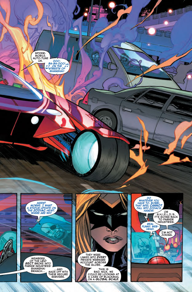 Spider-Man has gone global! Parker Industries is more successful than ever, with offices in New York, Shanghai, London and San Francisco and Peter Parker is racking up the frequent flyer miles with his “bodyguard” Spider-Man in tow, of course. But success breeds enemies and a reinvigorated Zodiac have also widened their scope to threaten the whole world. Join Dan Slott and Giuseppe Camuncoli as they take Spider-Man to the next level! This huge first issue also includes stories featuring Silk, Spidey 2099, Spider-Woman and much more!