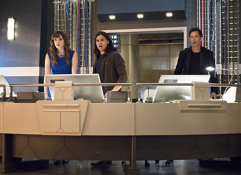 The Flash — “Enter Zoom” — Image FLA206C_0004b.jpg — Pictured (L-R): Danielle Panabaker as Caitlin Snow, Carlos Valdes as Cisco Ramon and Tom Cavanagh as Harrison Wells — Photo: Cate Cameron/The CW — é 2015 The CW Network, LLC. All rights reserved.
