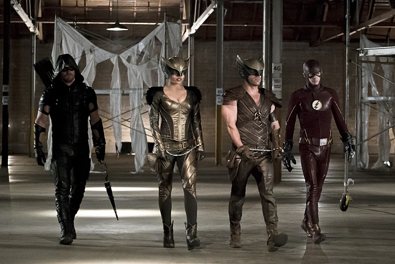 Arrow — “Legends of Yesterday” — Image AR408B_0231b.jpg — Pictured (L-R): Stephen Amell as The Arrow, Ciara Renee as Hawkgirl, Falk Hentschel as Hawkman and Grant Gustin as The Flash — Photo: Katie Yu/ The CW — é 2015 The CW Network, LLC. All Rights Reserved