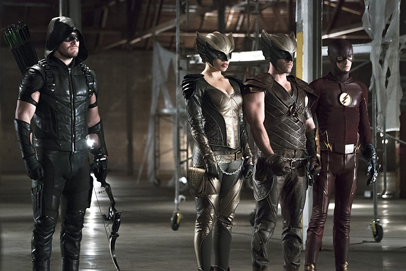 Arrow — “Legends of Yesterday” — Image AR408B_0242b2.jpg — Pictured (L-R): Stephen Amell as The Arrow, Ciara Renee as Hawkgirl, Falk Hentschel as Hawkman and Grant Gustin as The Flash — Photo: Katie Yu/ The CW — é 2015 The CW Network, LLC. All Rights Reserved.