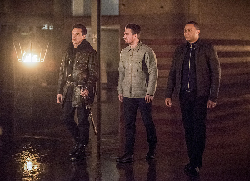 Arrow — “Sins of the Father” — Image AR413b_0007b.jpg — Pictured (L-R): John Barrowman as Malcolm Merlyn, Stephen Amell as Oliver Queen, and David Ramsey as John Diggle — Photo: Dean Buscher/ The CW — é 2016 The CW Network, LLC. All Rights Reserved.