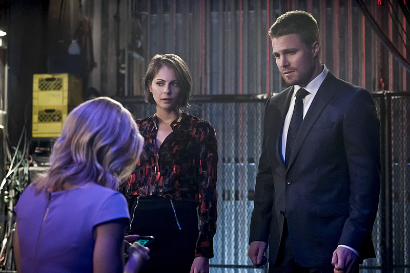 Arrow — “Code of Silence” — Image AR414b_0121b.jpg — Pictured (L-R): Emily Bett Rickards as Felicity Smoak, Willa Holland as Thea Queen, and Stephen Amell as Oliver Queen — Photo: Katie Yu/ The CW — é 2016 The CW Network, LLC. All Rights Reserved.