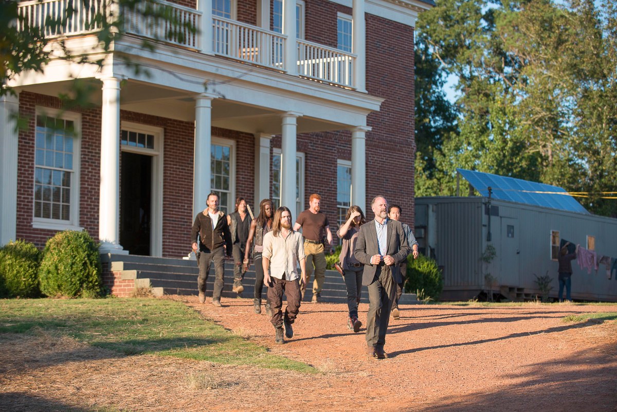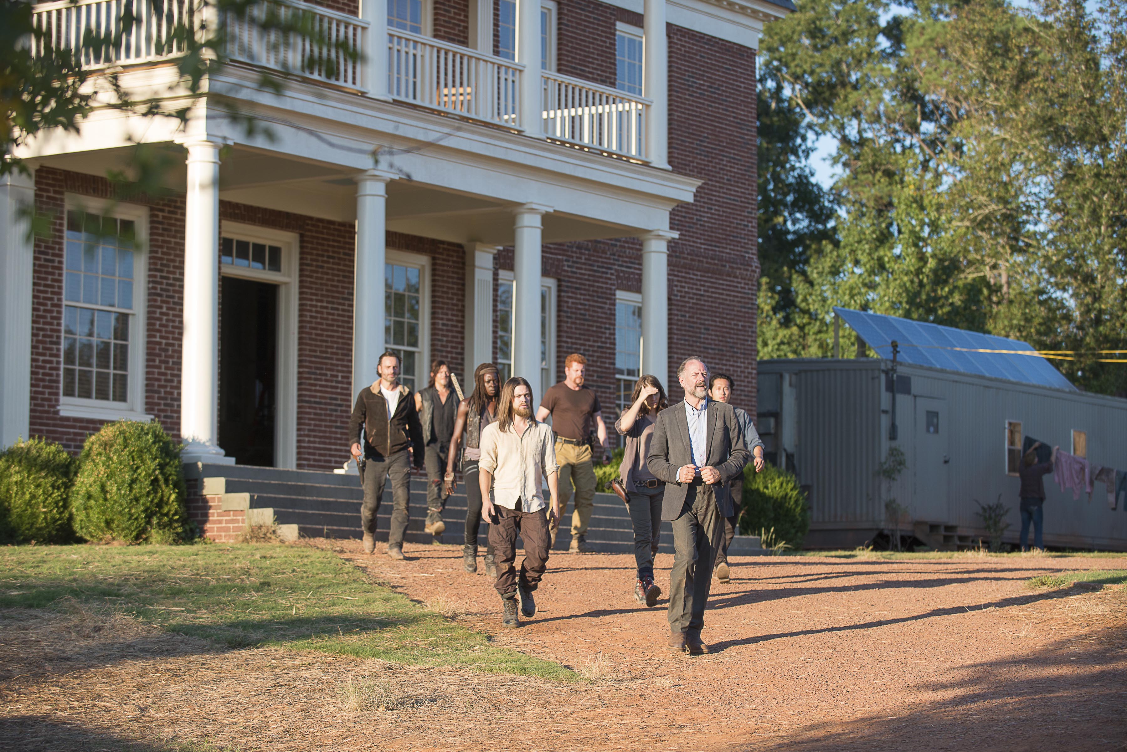 Steven Yeun as Glenn Rhee, Danai Gurira as Michonne, Michael Cudlitz as Abraham, Andrew Lincoln as Rick Grimes, Lauren Cohan as Maggie Greene, Norman Reedus as Daryl Dixon, Tom Payne as Jesus, and Xander Berkeley as Gregory- The Walking Dead _ Season 6, Episode 11 – Photo Credit: Gene Page/AMC
