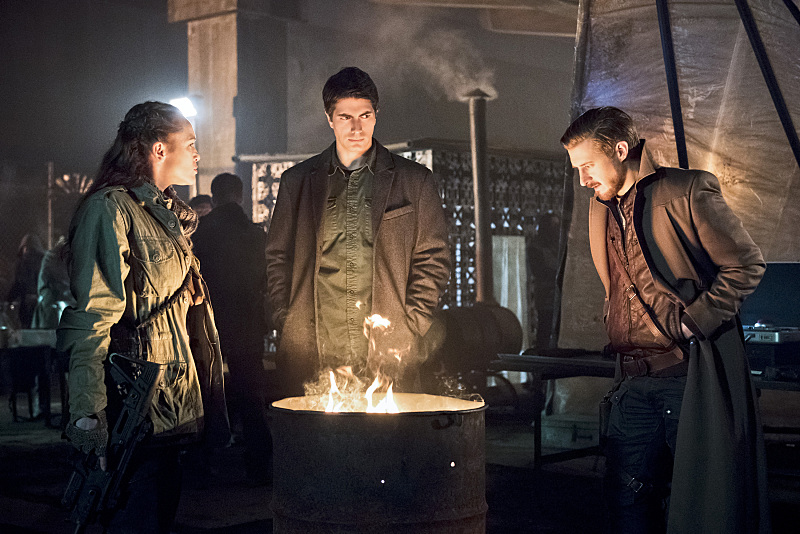 DC’s Legends of Tomorrow — “Leviathan”– Image LGN113a_0228b.jpg — Pictured (L-R): Sharon Taylor as Rebel Leader, Brandon Routh as Ray Palmer/Atom and Arthur Darvill as Rip Hunter — Photo: Dean Buscher/The CW — é 2016 The CW Network, LLC. All Rights Reserved.